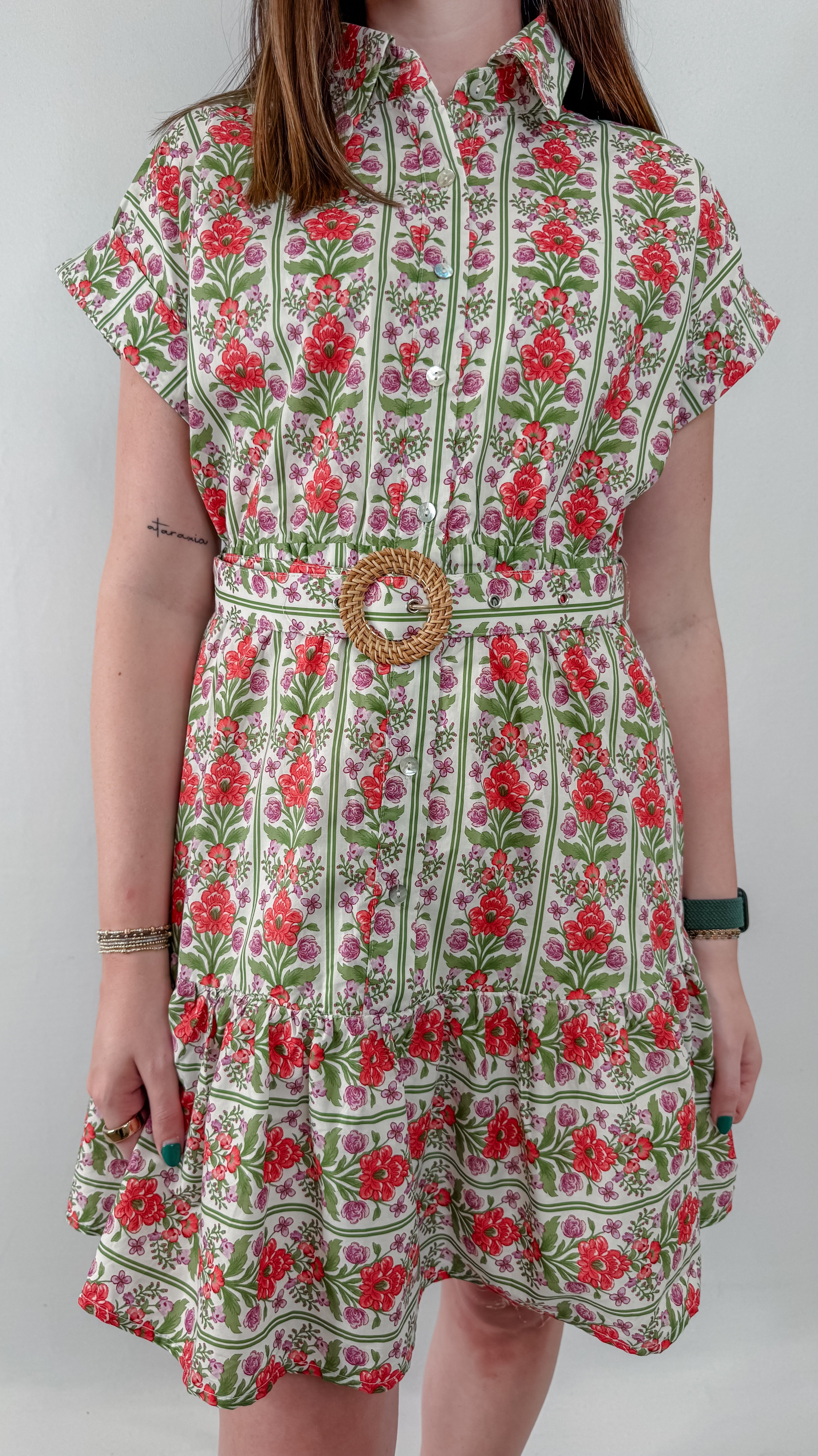 Embrace effortless elegance with the Emma Floral Mini Dress, featuring a charming tiered skirt that adds movement and dimension. The front button closure allows for easy styling versatility, while the wicker woven adjustable belt cinches your silhouette for a flattering fit. Perfect for spring outings, garden parties, or casual weekend adventures, this floral piece combines timeless femininity with modern comfort. The layered design creates visual interest, making it a standout addition to any wardrobe.