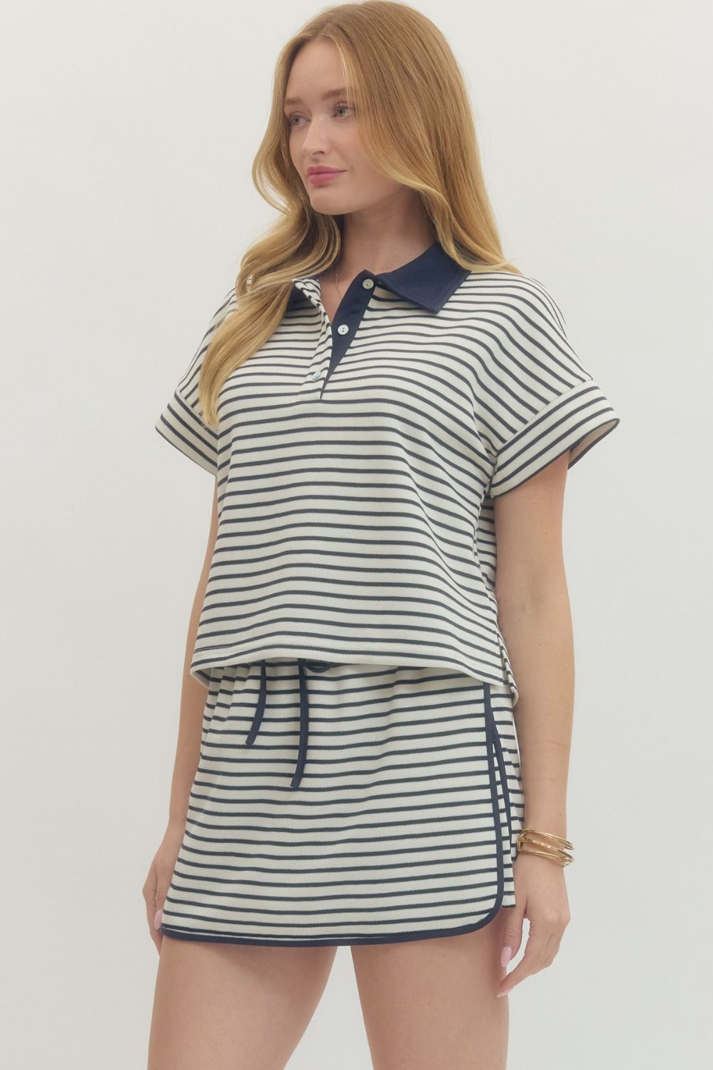 Meet your new wardrobe favorite—the Clairee Striped Top brings instant charm to any outfit. This lightweight knit features a fun striped pattern with a contrast collar and partial button closure that adds just the right amount of personality. Short sleeves and breathable, non-sheer fabric make it ideal for layering or standing solo. Unlined for maximum comfort, it's the perfect piece for mixing and matching through the seasons.