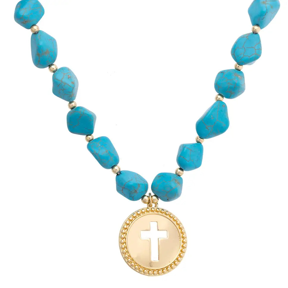 Turquoise stones and cross coin charms make this necklace a striking mix of rustic and modern. A must-have for Southwestern style lovers.