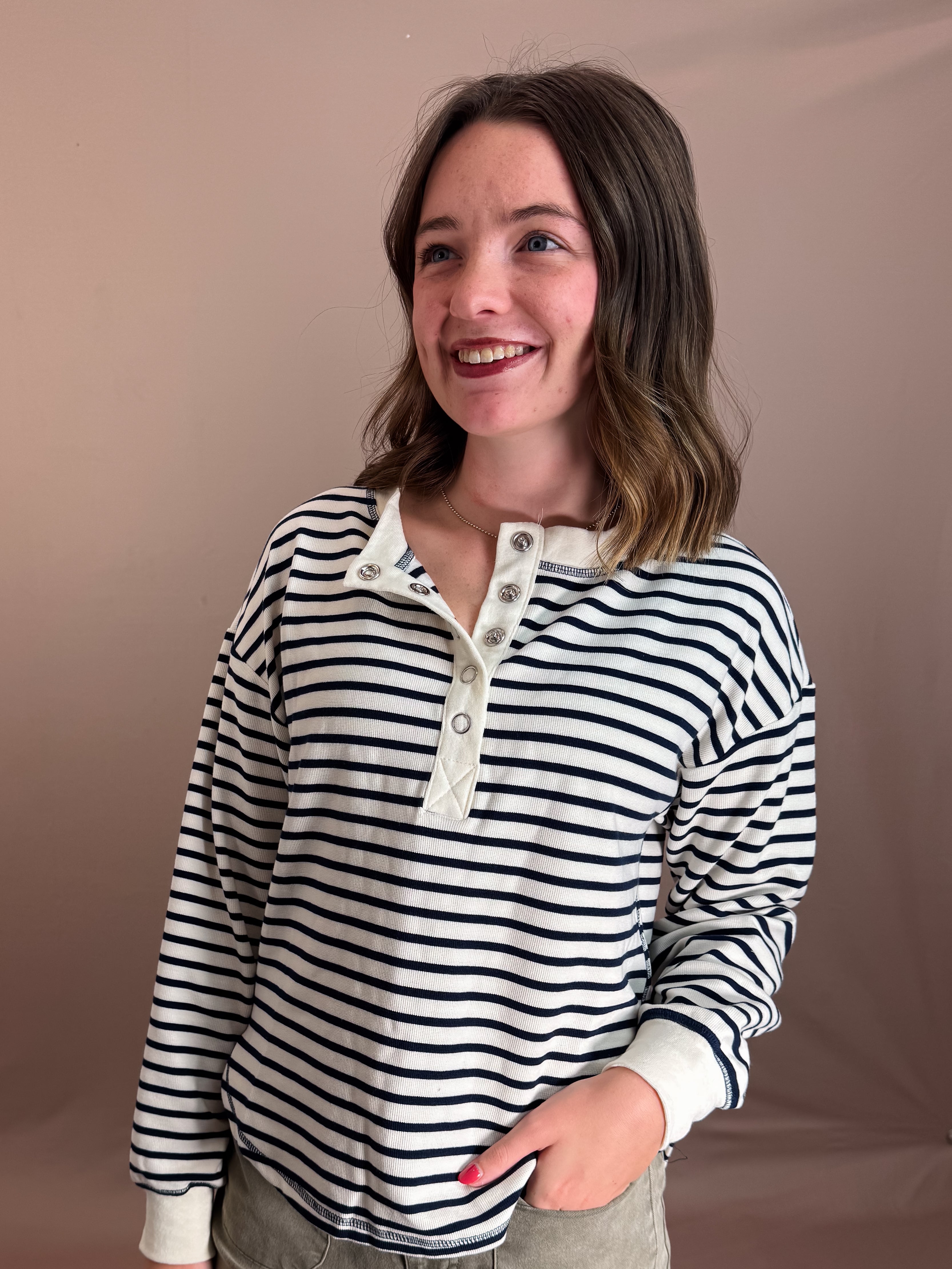 The Dara Henley Top brings a playful twist to your everyday wardrobe with its classic round neckline and signature henley button detail. Designed with long sleeves and a relaxed drop shoulder, this knit top offers cozy comfort and effortless style. The unique U-shaped hem adds a flattering finish, while the charming stripe pattern injects a splash of fun. Perfect for layering or wearing solo, this unlined top is ready to brighten up your casual looks with a lighthearted vibe.