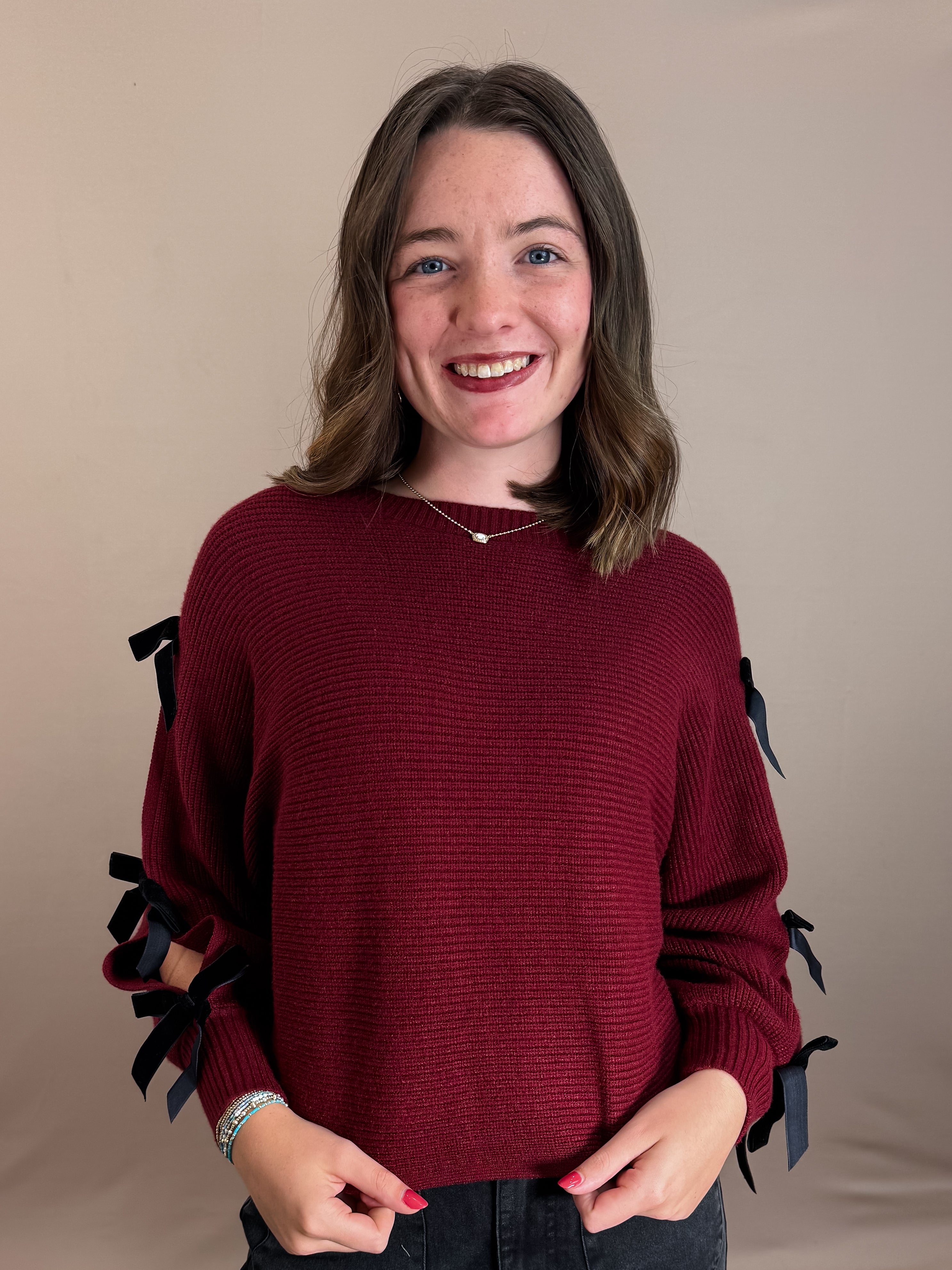 The Sydney Velvet Bow Sweater combines classic comfort with whimsical design. It features a round neckline and long sleeves, perfect for layering or wearing on its own. The standout velvet bow detail on the sleeves adds a playful touch, while the cut-out batwing silhouette brings a breezy, modern twist. Ribbed knit textures create a striking contrast against the solid fabric, giving this pullover sweater a unique and eye-catching look. Soft and cozy, it’s your go-to piece for adding a bit of fun and flair to chilly days.
