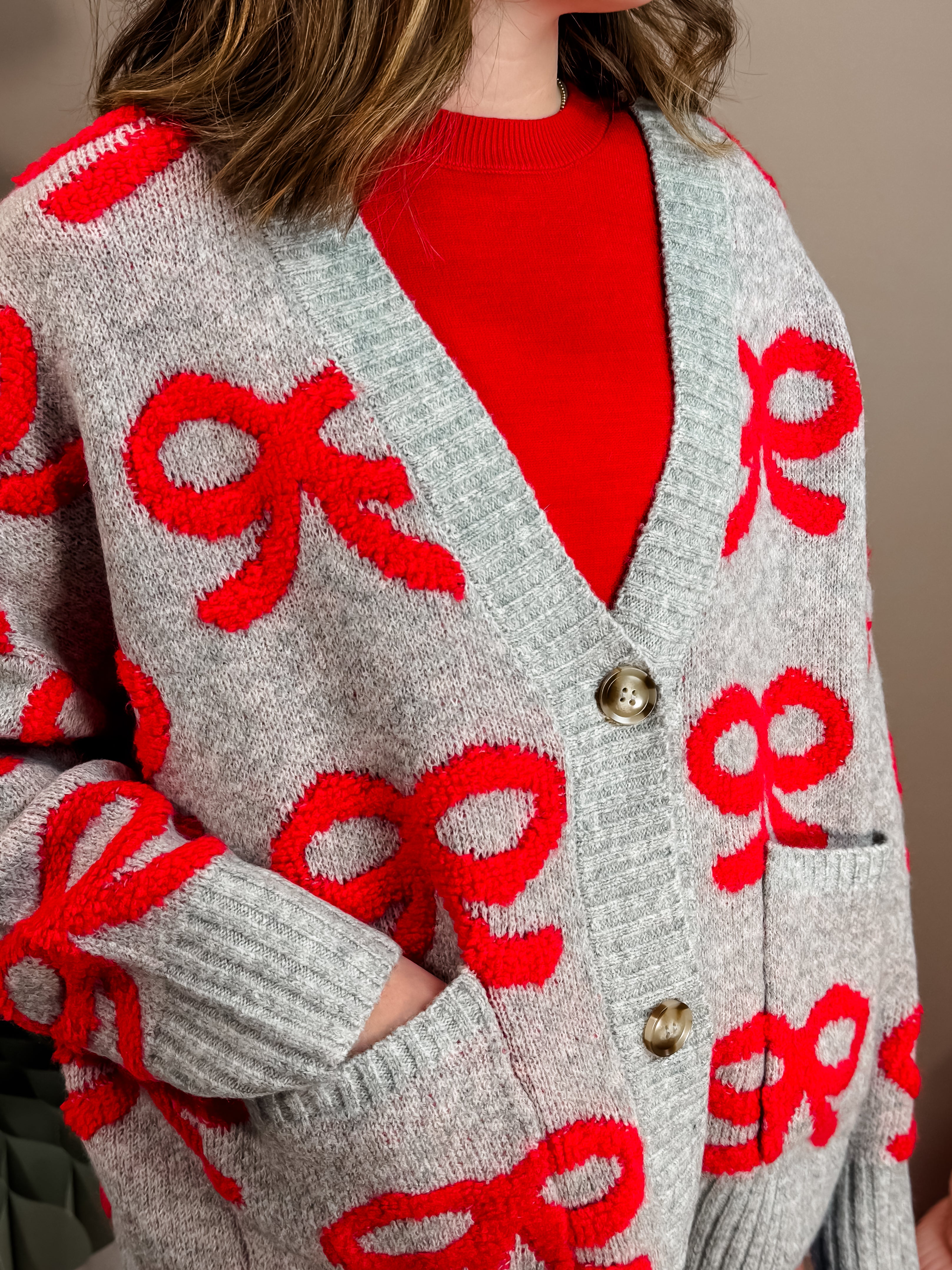 Embrace cozy charm with the Heather Bow Knit Cardigan, designed to brighten your chilly days. This oversized sweater features a playful bow jacquard pattern that adds a touch of whimsy to its relaxed fit. Its V neckline and long dropped shoulders create an effortlessly stylish silhouette, perfect for layering. Crafted from a soft wool blend, this cardigan keeps you warm while feeling light and comfy. Whether you're dressing up or down, it’s a fun and flirty knit that makes comfort look cool.