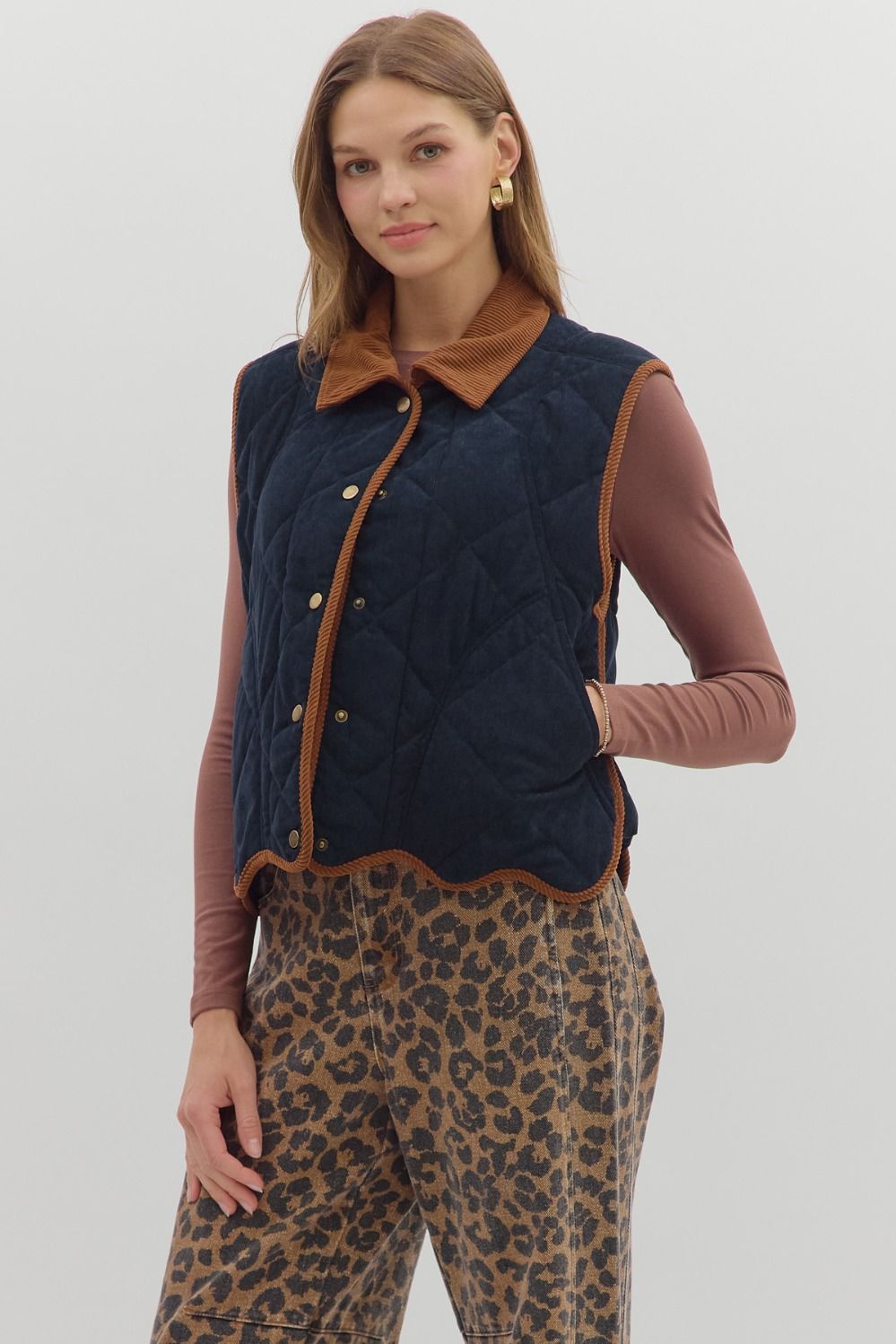 This solid sleeveless corduroy quilted vest is your go-to for warmth without the bulk. Featuring a snap button front, front pockets, and a playful scalloped hem and collar for a charming contrast, it’s lined and lightweight for easy layering. Perfect for those who appreciate cozy comfort with a quirky twist!