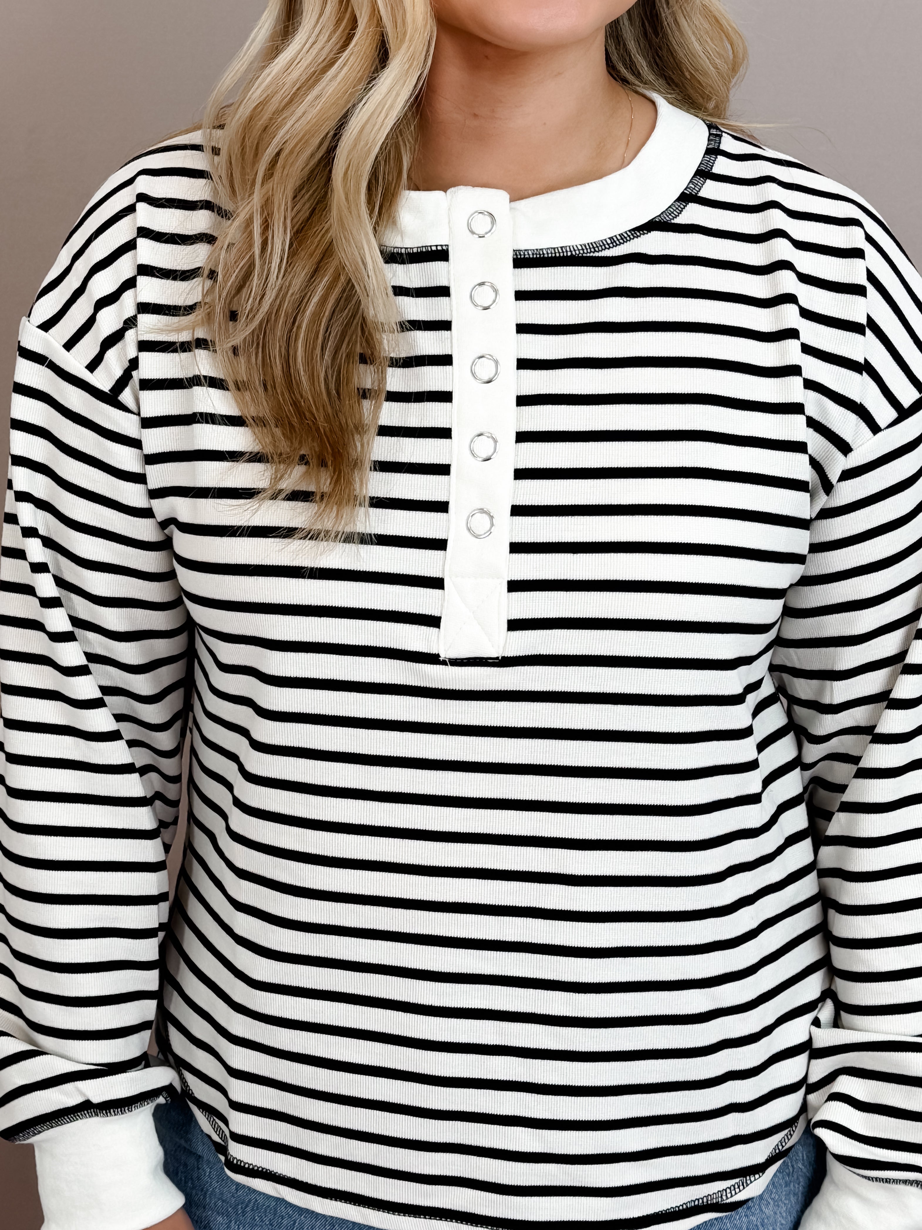 The Dara Henley Top brings a playful twist to your everyday wardrobe with its classic round neckline and signature henley button detail. Designed with long sleeves and a relaxed drop shoulder, this knit top offers cozy comfort and effortless style. The unique U-shaped hem adds a flattering finish, while the charming stripe pattern injects a splash of fun. Perfect for layering or wearing solo, this unlined top is ready to brighten up your casual looks with a lighthearted vibe.