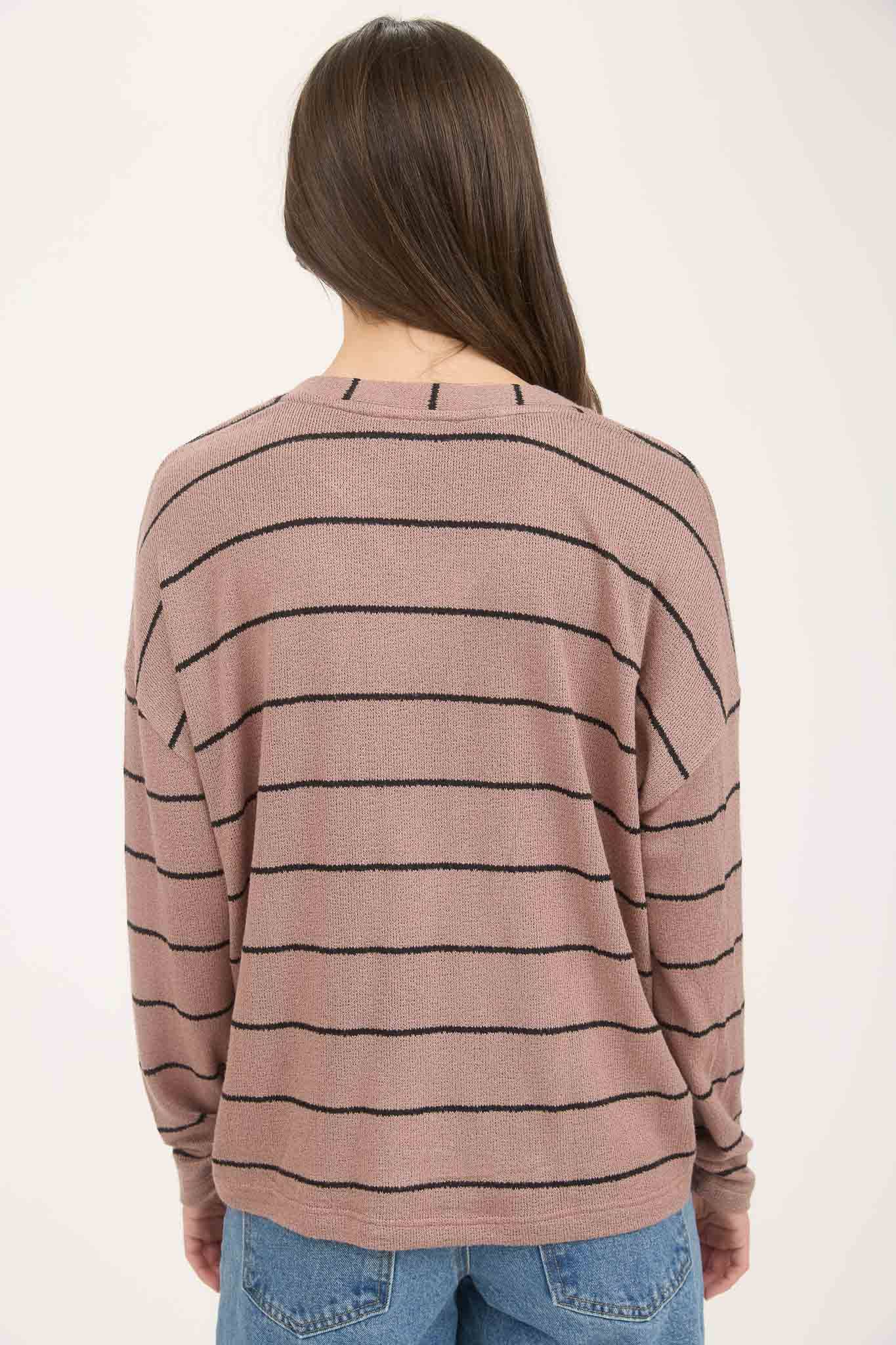 The Maggie Stripe V-Neck Top is your new favorite wardrobe essential, blending cozy comfort with cheerful style. Designed with a relaxed drop shoulder and long sleeves, this knit top moves with you, perfect for those laid-back days when you want to feel effortlessly cool. Its bold stripe pattern adds a dash of playful charm, making it a standout piece whether you're pairing it with jeans or layering under a jacket. Light and breathable with no lining, it offers flexibility and ease, so you can dance, lounge, or explore in style. Add a splash of fun to your everyday look with this vibrant, easygoing top.