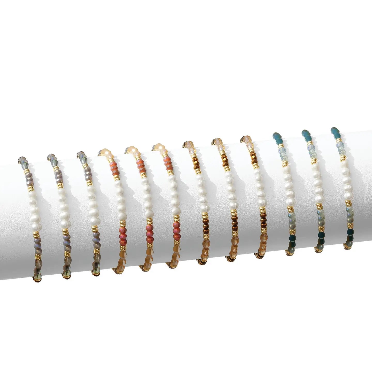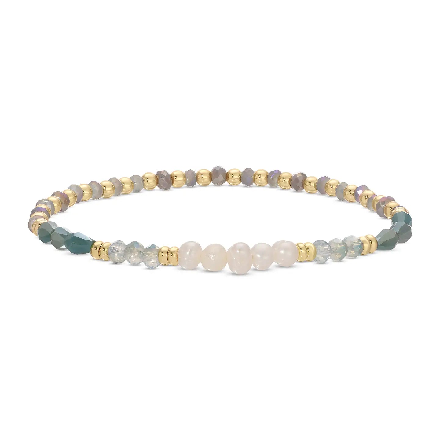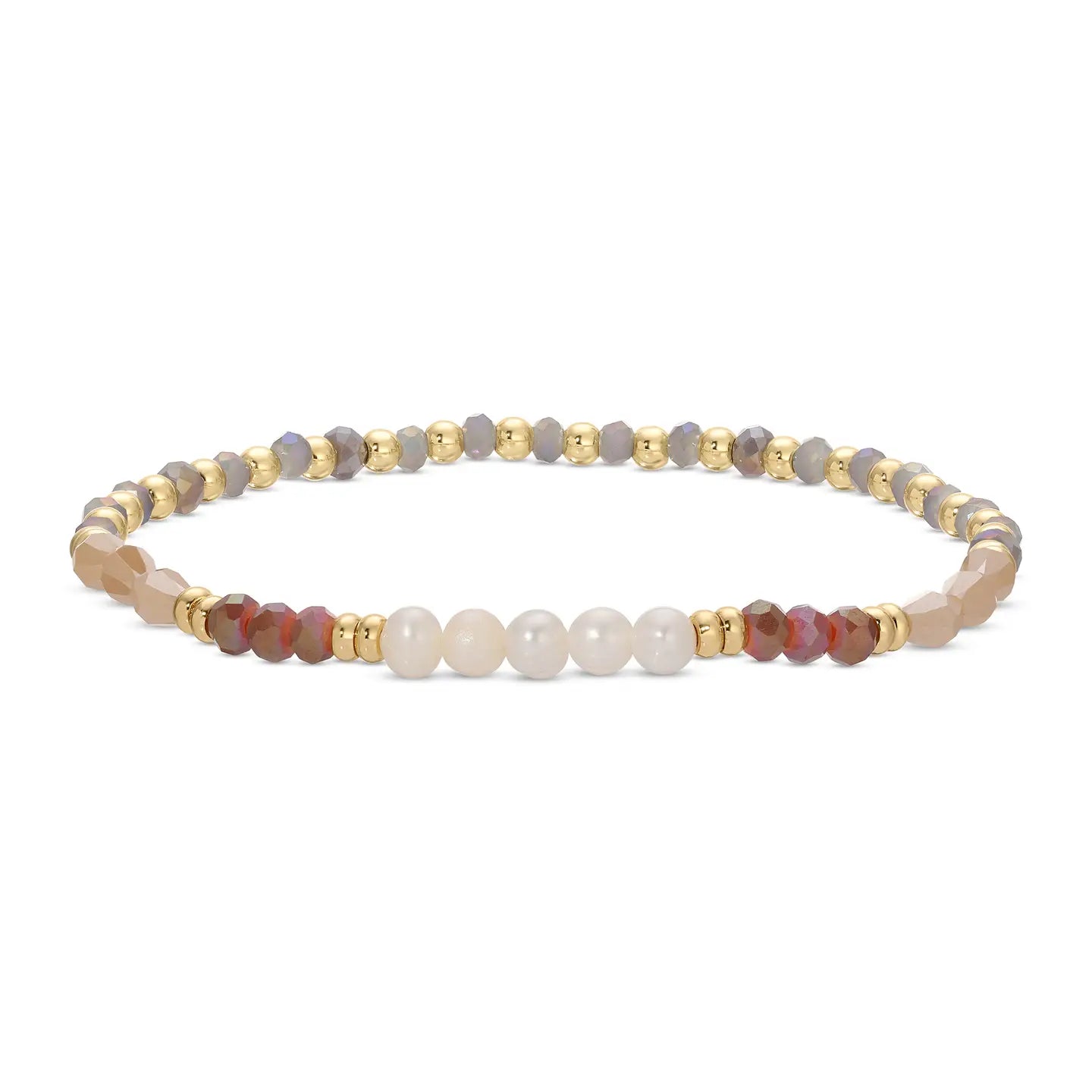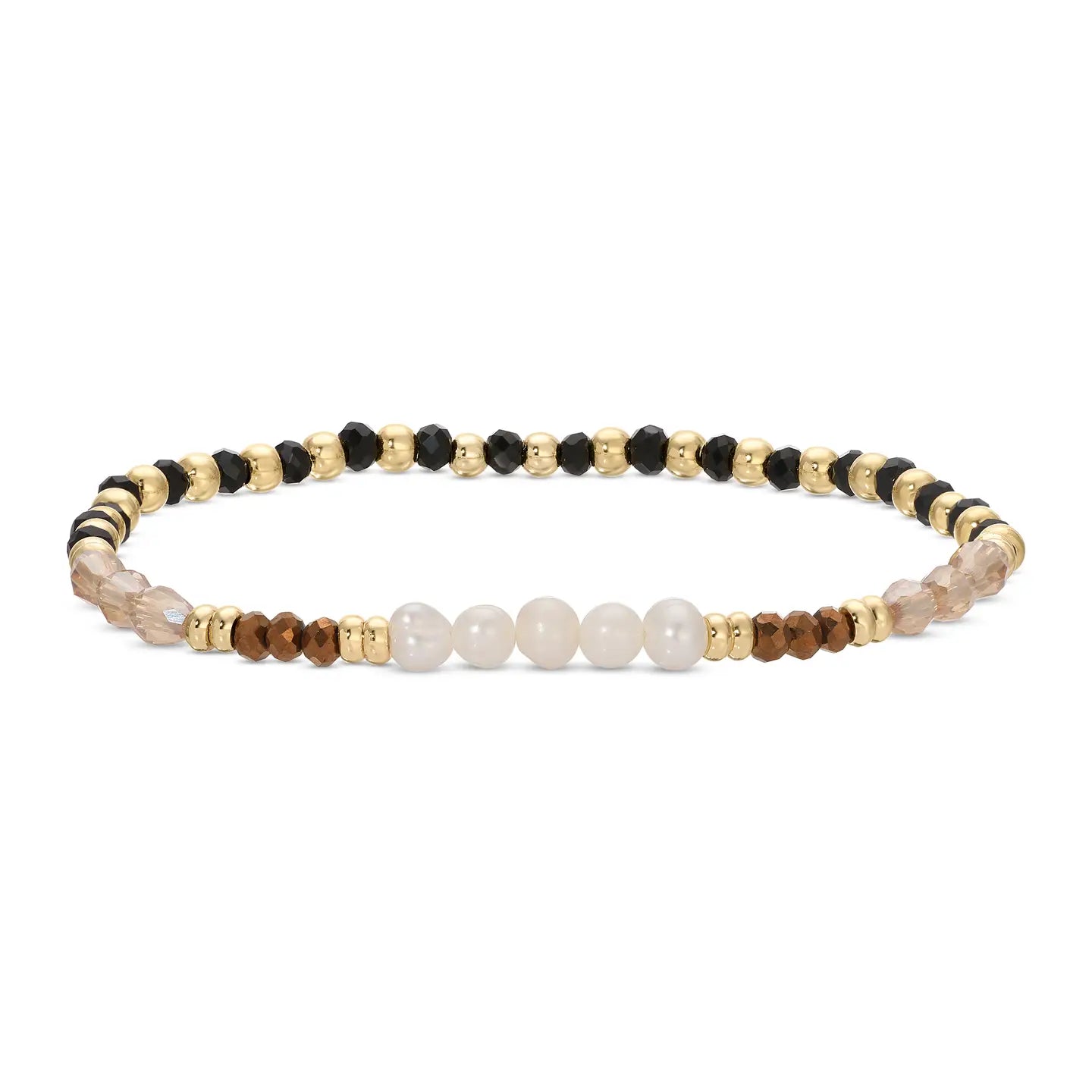 This playful Crystal and Pearl Stretch Bracelet is about 6.5 inches long, made with 18k gold-plated brass, freshwater pearls, and sparkling glass crystals. Its stretchy design makes it comfy and easy to wear alone or with other bracelets for a fun, stylish look.